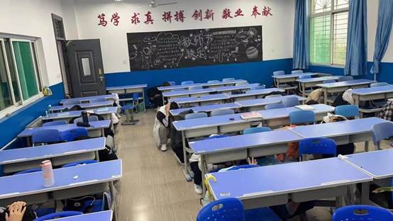 下午4:10,随着第一次警报的拉响,演练正式开始。上课教师立即停止授课,转而成为教室演练负责人,告知学生“地震来了,不要慌”,并指挥学生迅速抱头、闭眼,躲在各自的课桌旁,尽量蜷曲身体,降低身体重心,两臂交叉保护头部。