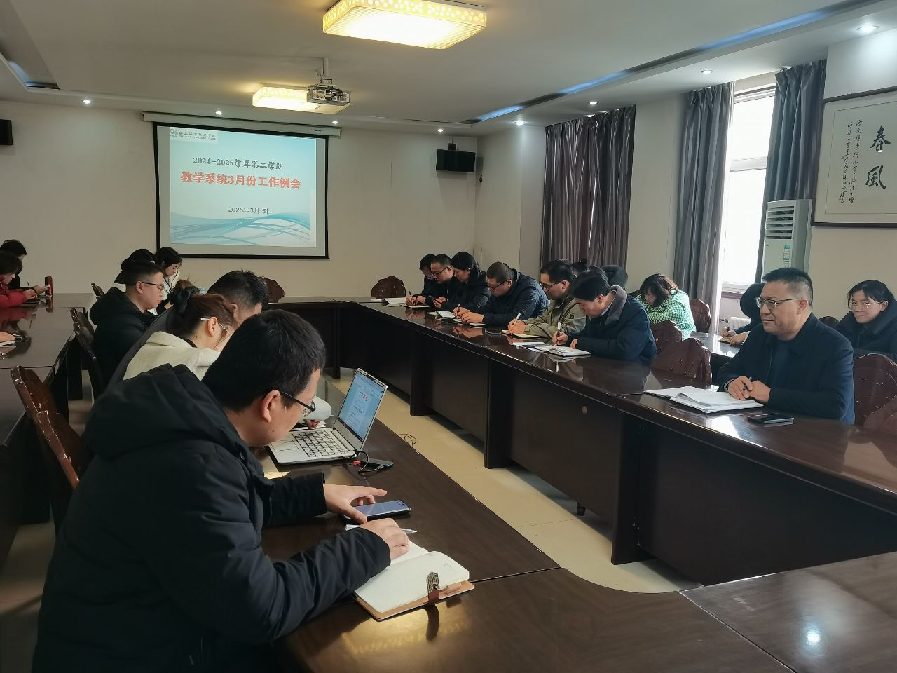 教务处张建利处长对2月份教学运行工作进行点评,同时对3月份15项重点工作安排部署。主要包括:学生技能大赛;国、省规划教材建设;教师教学能力比赛;创新大赛;2023级学生实习工作;2025届毕业生毕业审核工作;2025年综合评价招生考试;专升本工作;2023级学生信息采集;教学资源建设,试题库建设;实验室安全检查;人才培养方案修订;办学能力评价;教学辅导与在线课程;学术报告等。