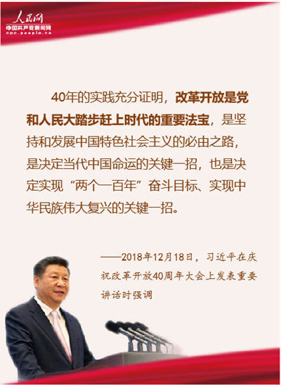 40年的实践充分证明,改革开放是党和人民大踏步赶上时代的重要法宝,是坚持和发展中国特色社会主义的必由之路,是决定当代中国命运的关键一招,也是决定实现“两个一百年”奋斗目标、实现中华民族伟大复兴的关键一招。