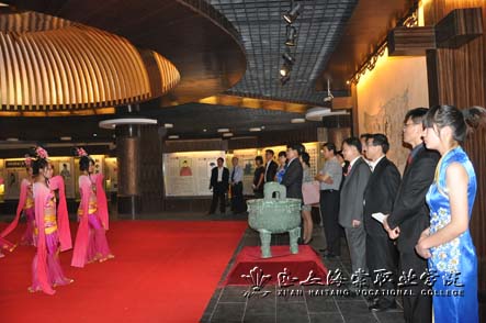 参观过程中各位来宾不时对馆内的精致展品发出阵阵赞叹,并表现出浓厚的兴趣。行至中展区,学院精心安排的舞蹈吸引了众人的眼球。之后,在讲解员的带领下各位外宾参观了海棠中医美容展室,并给予了很高的评价。