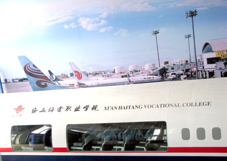 在专业的航空教学过程中,如果没有专业的教学设备,就无法让学生在民航职业技能培训方面得到合格的培训。面对新的挑战和机遇,2010年学院又投入大量资金建成国内一流的教学模拟航空港,航空港内包括:航空模拟机舱、安检门、x光机、值机系统、票务模拟系统、呼叫中心等,以便将学生的实习实训和教学有机的结合。