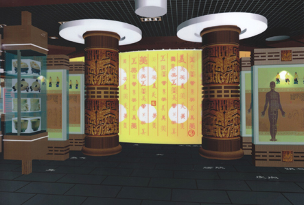 博物馆整体设计风格古香古色,厚重大气。走进博物馆,首先映入眼帘的是中国思想史和古文专家、陕西省教育厅方光华副厅长撰写的《中国中医美容博物馆赋》,赋文功底深厚,文辞典丽,旁征博引,寓意深远。赋的两侧有王昭君与杨贵妃的塑像,容貌娇艳,神态妩媚,她们是古代女性美的象征。展厅中央以中国传统养生文化最具核心内容的“精”“气”“神”为主题展开,蕴含了中国古代“天人合一”的自然哲学思想,体现了祖国古代医学美容、养生、保健的精华所在。一尊西汉大克鼎矗立在穹顶下方,与博物馆厚重的历史氛围浑然一体。