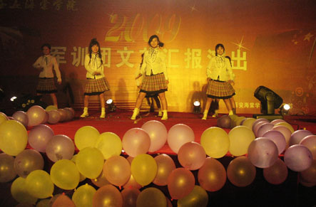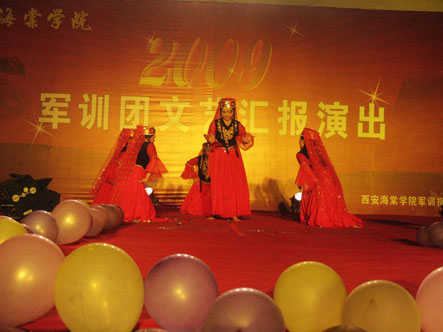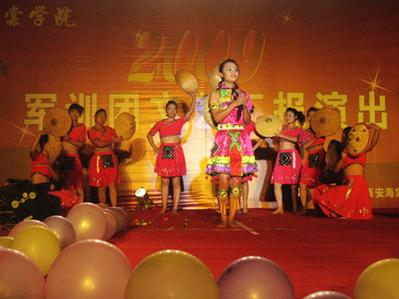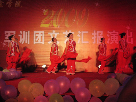 演出中,各连队和教官们自编自演了丰富多彩的节目,有唱歌、舞蹈、小品、诗朗诵、舞台剧、器乐等。动感十足的街舞表演, 清新醉人的乐器演奏,令人捧腹的相声表演,深情温婉的歌曲演唱,现场气氛热烈,掌声不断。 师生们用动听的乐曲,优美的舞姿,充分展现了当代大学生的良好精神风貌,讴歌了军民鱼水深情,教官们以雄壮的军歌、刚劲的动作,演绎出人民解放军的风采。十四连的一首《开门红》拉开了军训汇演的帷幕,轻松欢快的节奏,热情奔放的舞姿,展示出了当代大学生的精神风貌。舞蹈表演成了今年的一大亮点,带有民族特色的《新疆舞》、《顶碗舞》,带有军队气息的《军中姐妹》都给学生们留下深刻印象。带有东北民族特色的东北民歌对唱,更是赢得了在场观众的一致好评。军训团团长的一首《草原上升起不落的太阳》更是把会场气氛推向了高潮。教官们精彩的《武术》节目,引人入胜的表演令人目不暇接,赢得了广大师生阵阵热烈的掌声。最后在一首《盼团圆》的精彩表演中,文艺汇演划上了圆满的句号。