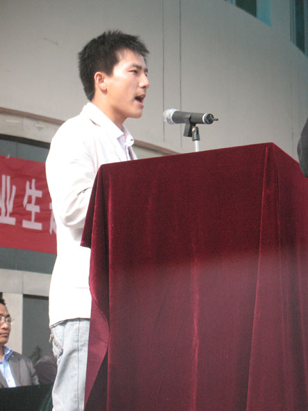 此次欢送仪式在国歌声中拉开帷幕,优秀毕业生王敏、陈晓鹏代表09届毕业生发言,他们对母校的辛勤培养表示了感谢,表示他们一定会努力工作来回报母校,同时他们对在校的学弟学妹提出了祝愿和期望。