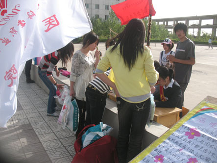 本次活动中捐赠衣物的学生很多,他们把自己用过的书籍,穿过的衣服等物品都捐了出来,有的同学甚至把自己喜欢的玩具也奉献了出来。胸部佩戴红色条幅的学生会负责人很热情的登记,并将所捐赠的物品整理好。