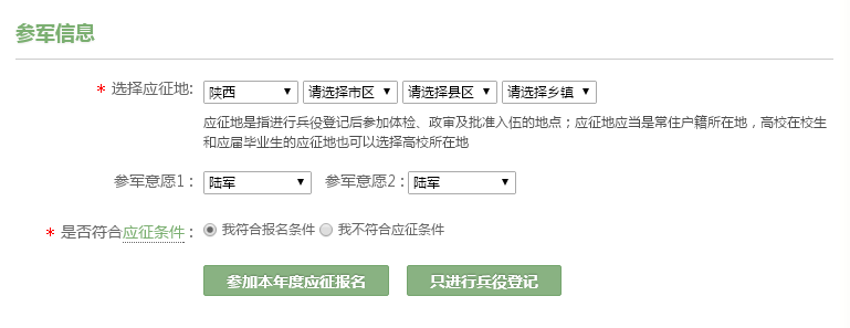 如果今年想入伍的小伙伴,就请选择左侧按钮。如果想此后的年份再入伍的小伙伴,就请选择右侧的按钮!